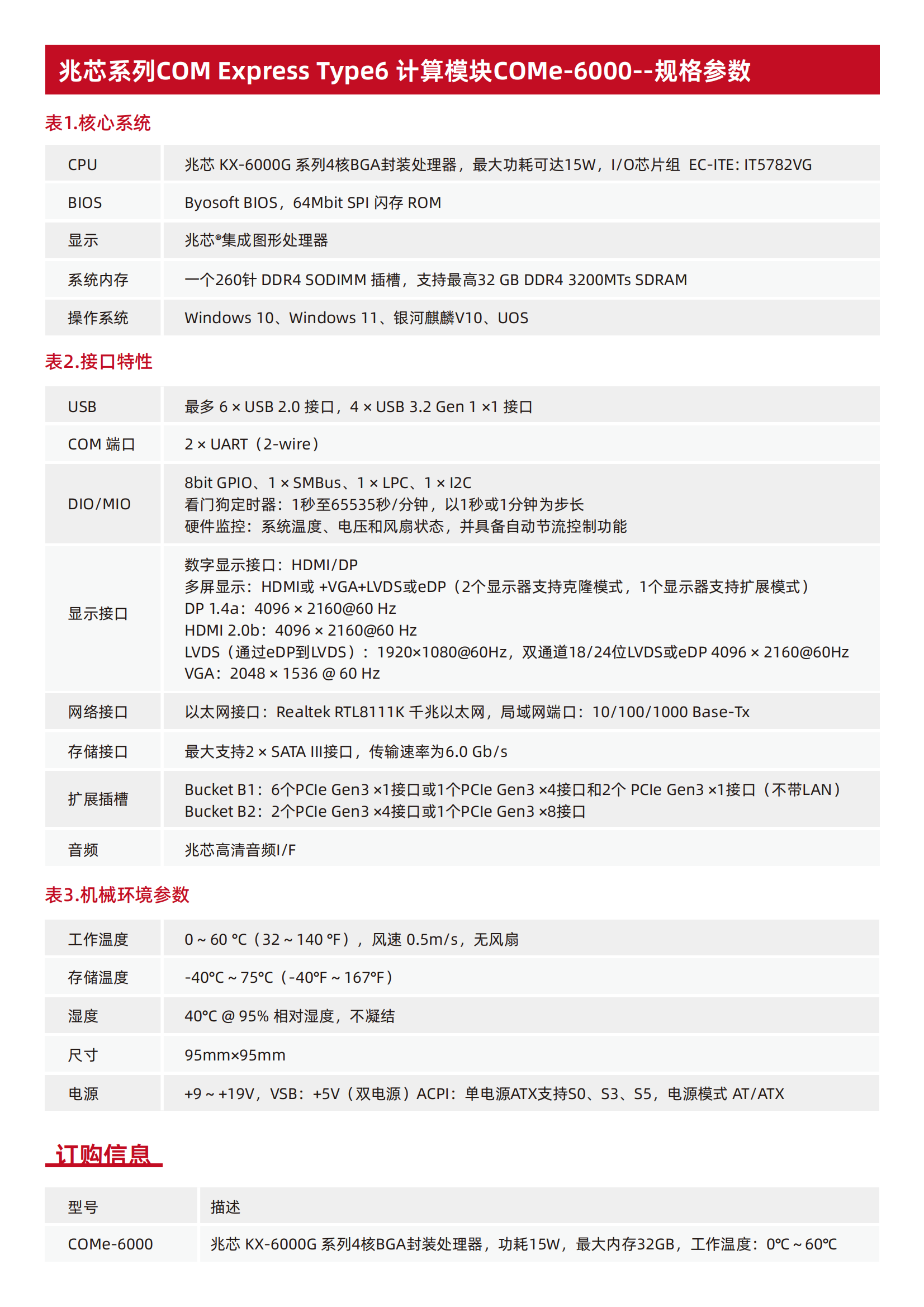 COMe-6000 是兆芯 KX-6000G 系列驱动的 COM Express Type6 计算模块,以国产低功耗四核算力为核心,融合看门狗自愈、宽压供电、系统健康监测等可靠性设计,搭配内存扩展与集成显示,兼容多系统,构建自主可控、稳定高效的嵌入式算力底座 。