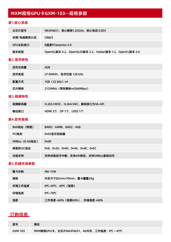 GXM-103 是国产自主 MXM 规格 GPU 卡,基于自研 NA3FA651 芯片,聚焦嵌入式设备 2D/3D 渲染、高清视频处理及通用计算 需求。通过 LPDDR4X 显存、8 通道 PCIe Gen3 构建高速通路,兼容多图形 API,以 4W-15W 弹性功耗,适配工业控制、智能终端等 “自主可控 + 图形性能” 双需求场景 。