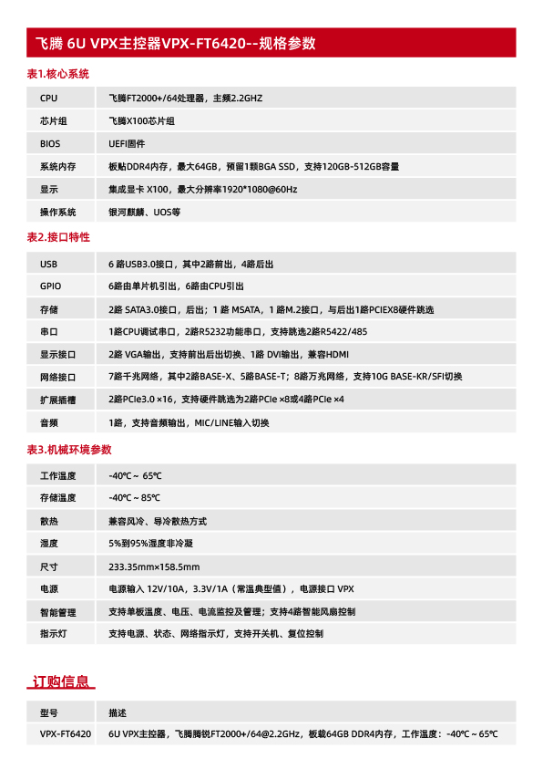 VPX-FT6420 是飞腾 FT2000+/64 核驱动的 6U VPX 主控器,以全国产化设计(100% 自主芯片)契合 Vita65 规范,通过 64 核算力支撑大规模并行运算,集成系统监控、存储扩展与显示功能,兼容银河麒麟 / UOS,构建 自主可控、高可靠 的 VPX 计算节点 。